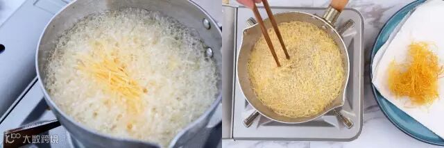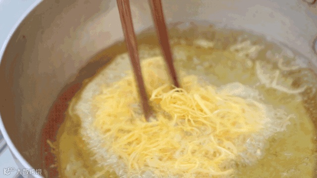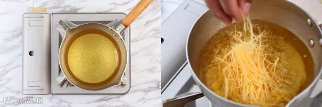 热锅起油,用筷子放入油锅中试油温,筷子周围冒泡时放入红薯丝