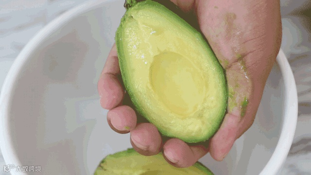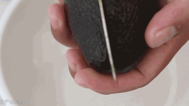 牛油果用刀沿着中间竖切转一圈,切到核为止,然后左右手拿着两半牛油果扭转,很容易分成两半