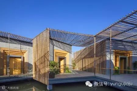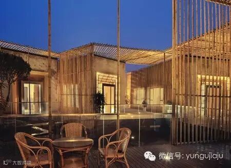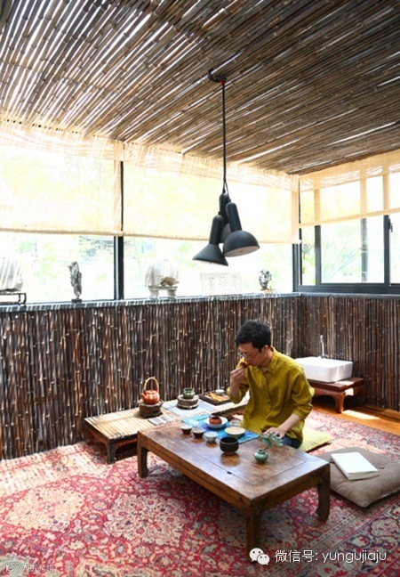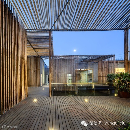 带有强烈手工艺痕迹的元素,却令这个骨子里是现代建筑的茶室酝酿出原汁原味的东方意趣。茶室的外墙都被竹子包裹起来,配上竹篾搭起的门扉,捆绑竹子与竹篾的材料选择的是最普通的麻绳,在阳光或是灯光映照下,营造出特别的光影效果。