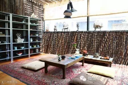 走进观看,整个茶室空间的设计,主要靠紫竹围成墙面与竹帘遮挡的窗棂构成。左右两边摆放明清古物的茶器架,一个出自明时木制橱柜,一个来自宜家的货架。窗台上既有菲利普•斯塔克为Alessi做的经典设计Juicy Salif不锈钢榨汁器,也有古董石刻匾额“寻芳园”。