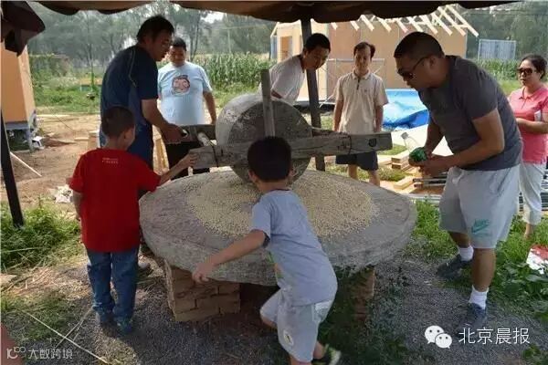 大人带着孩子推磨磨豆浆。