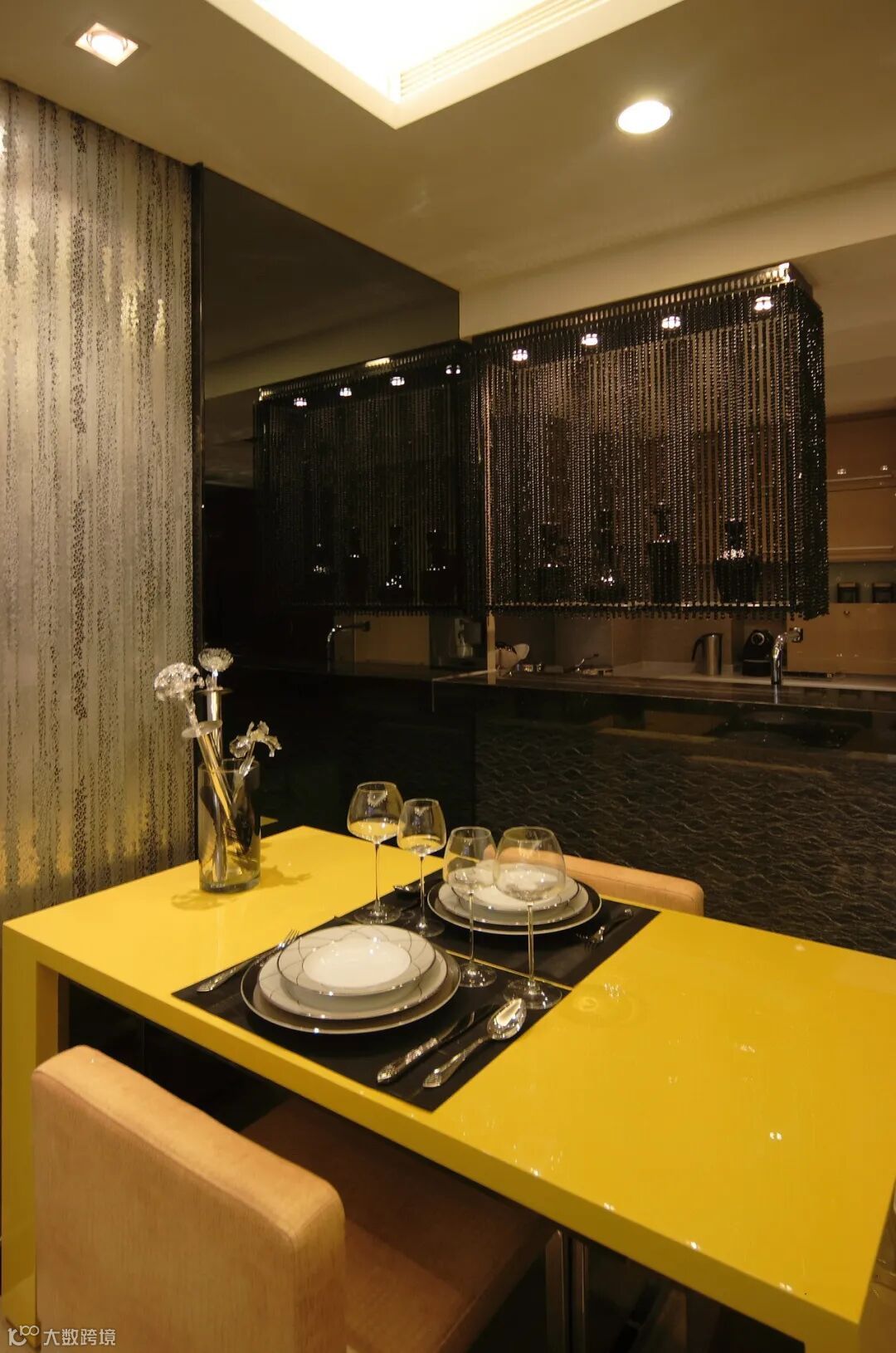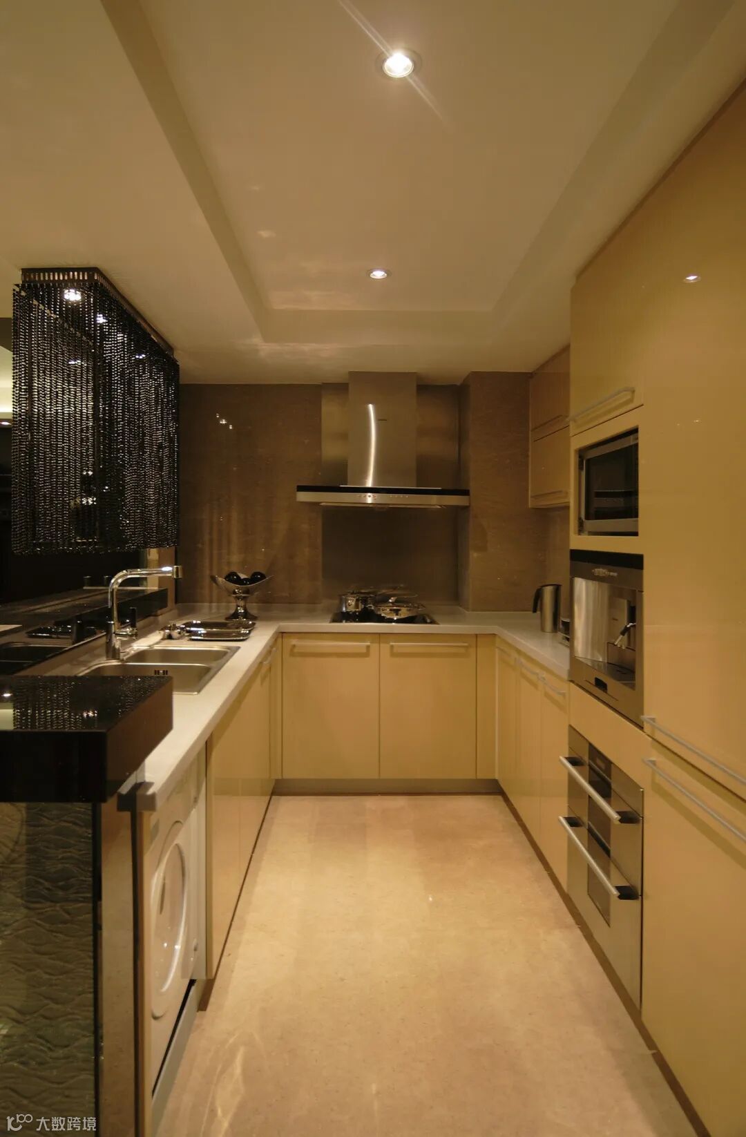 入户门视角,客厅无主灯设计,开放厨房吧台内将洗衣机也放置其中。开放厨房与客厅之间由珠帘围合了一排筒灯作为隔断将功能区做了巧妙分隔。