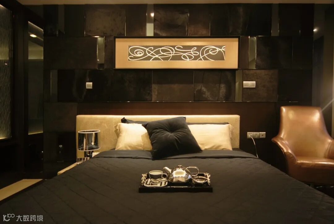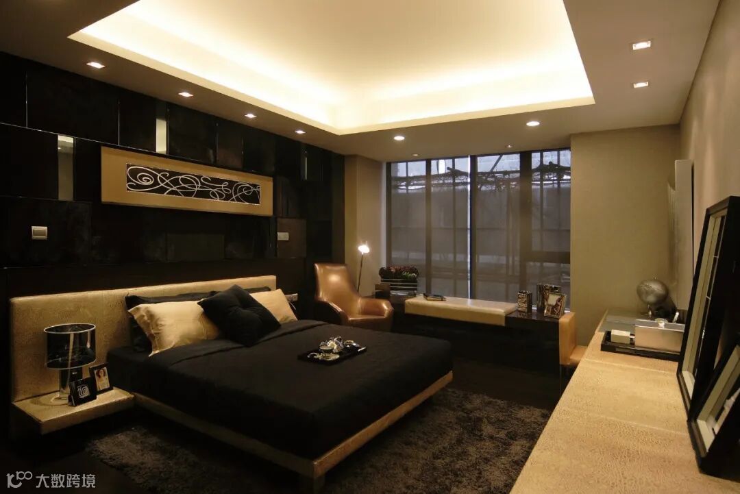 卧室设计与客厅颜色配色同样做法。大面积的色块做自动分区。卧室背景墙与床品做深色设计呼应,床头软包、 装饰画、沙发椅、储物柜使用香槟金色。暖光照明设计。整个空间端庄贵气。