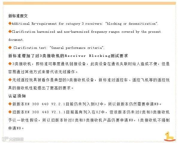 EN 300 440是由欧盟颁布的RED指令标准。新版本EN 300 440 V2.2.1已于2020年4月30日正式取代旧版本EN 300 440 V2.1.1,并且对遥控车、遥控飞机等的遥控玩具的接收机性能提出了更高要求。