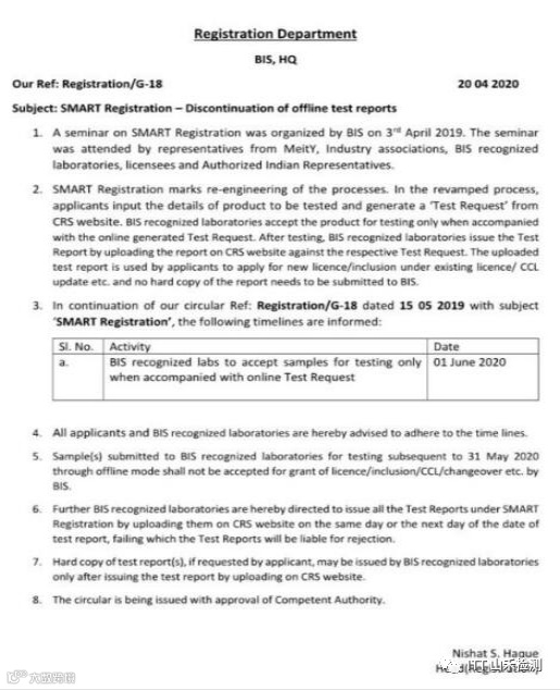 早前,印度BIS组织了一次SMART(智能)注册研讨会。参与本次研讨会的代表来自MeitY、行业协会、BIS认可实验室、被许可方和印度授权代表。会议主要讨论了取消线下测试报告的一系列举措。根据会议内容,2020年6月1日起,BIS将不再接受线下测试报告,所有测试均需在CRS网站上进行申请,之后再由BIS认可实验室进行测试,测试报告将直接上传至CRS网站,无需再将测试报告副本提交给BIS。