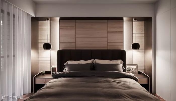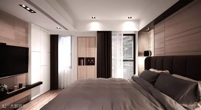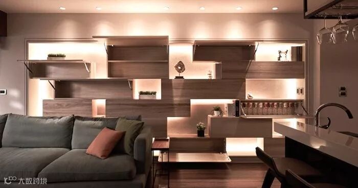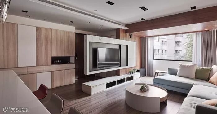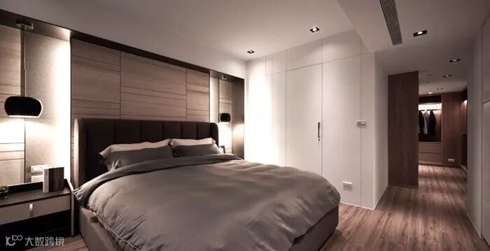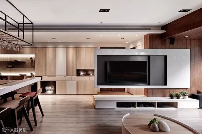 现代简约风,定制的固定家具比重非常大。有衣帽间,储物柜,书架,展示柜木饰面,背景墙装饰等定制家具。