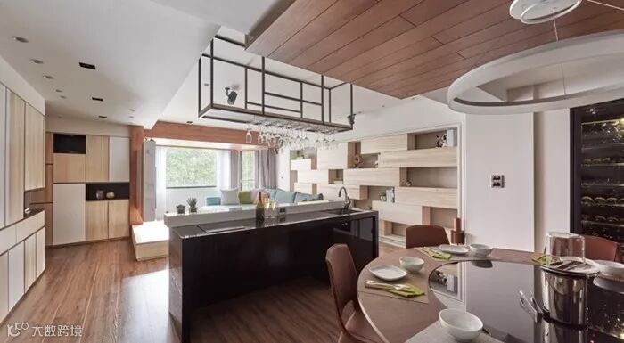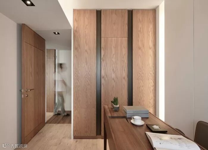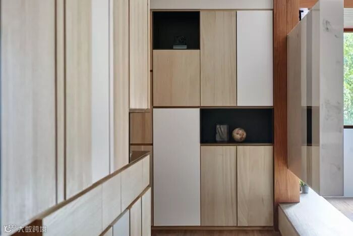 这个空间出彩的地方在于没有单纯使用一种原木色运用空间,而是采用了一深、一浅两种原木色模板和白色做空间设计,和装饰。空间层次和视觉效果非常灵动,温馨。同一个柜体上使用木色和白色门板拼色。