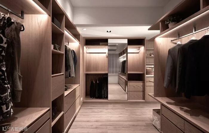 瑞丰兴源家具现代简约风,定制的固定家具比重非常大。有衣帽间,储物柜,书架,展示柜木饰面,背景墙装饰等定制家具。