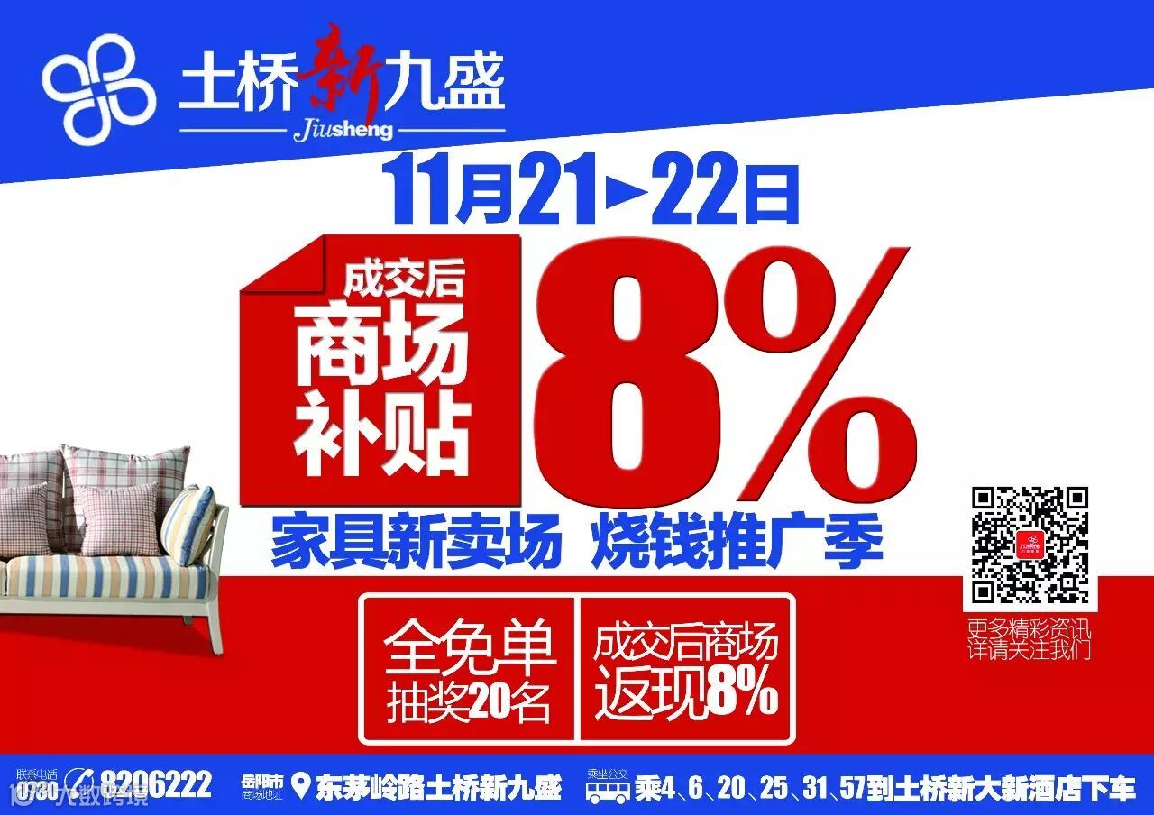 土桥新九盛 地址:湖南岳阳市东茅岭路土桥九盛家居 营业时间:9:00 - 17:30 电话:0730 - 8206222 客服微信:JIUSHENGJIAJU