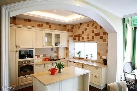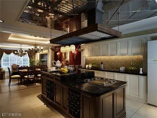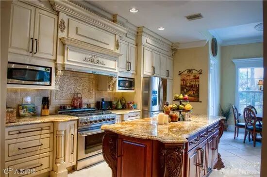 厨房开敞:厨房在美国人眼中一般是开敞的(由于其饮食烹饪习惯),同时需要有一个便餐台在厨房的一隅,还要具备功能强大又简单耐用的厨具设备,如水槽下的残渣粉碎机,烤箱等。需要有容纳双开门冰箱的宽敞位置和足够的操作台面。在装饰上也有很多讲究,如喜好仿古面的墙砖、橱具门板喜好用实木门扇或是白色模压门扇仿木纹色。另外,厨房的窗也喜欢配置窗帘等。