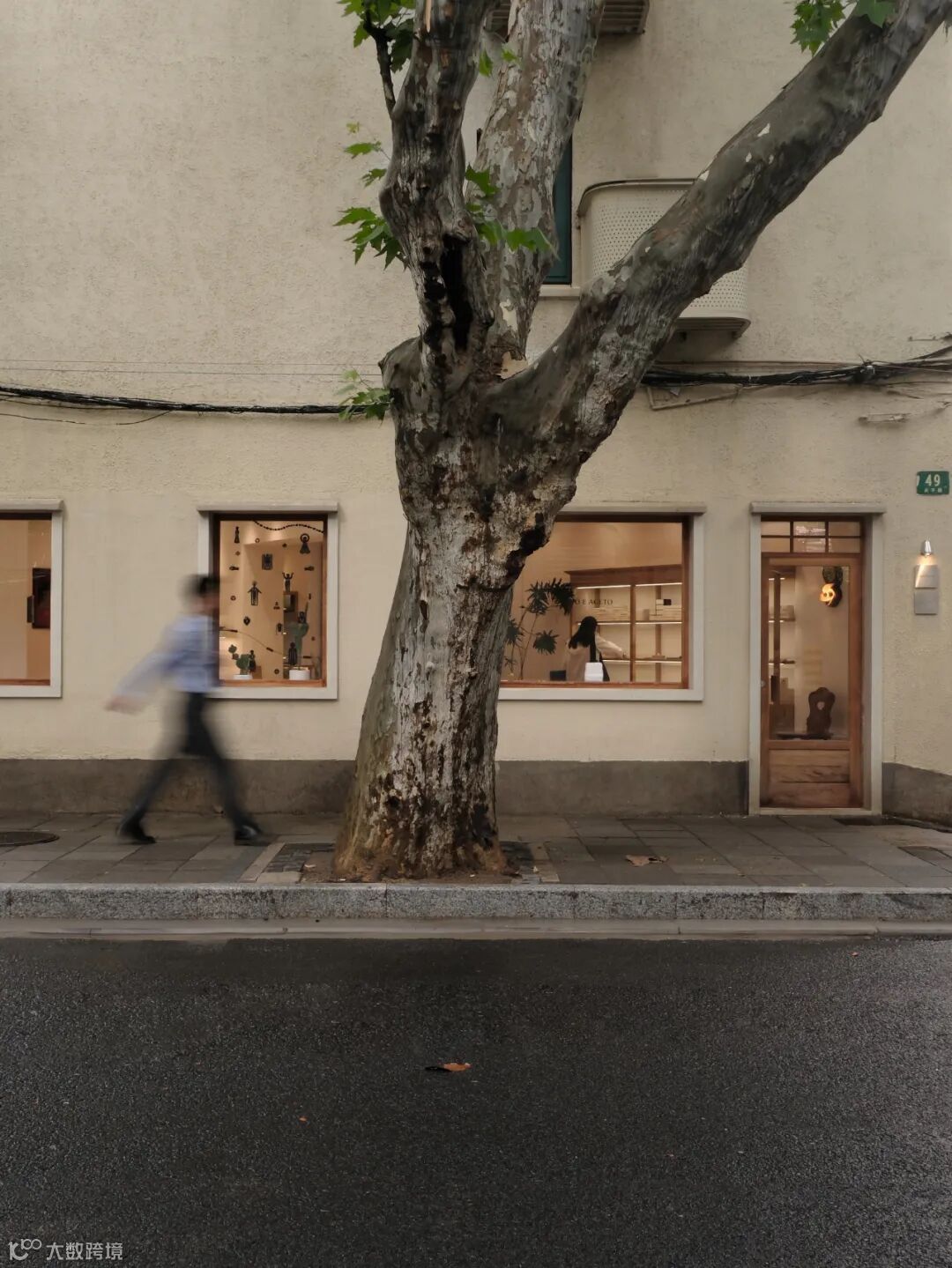 柚木门外,桐影多姿,映落于米黄色的墙面,墙上爬过成束的管线,更上方是静挂着的空调外机罩子。上海总给人“老而新”的感觉,时间在这座城市里层叠,如同木的纹理,在光影与距离之间,组织出一种积淀的生命力。