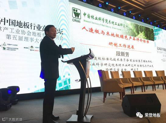 中国林产工业协会轮值会长叶克林作主题报告。他表示,中国地板产业现状特点是产销量呈稳步增长趋势、高端产品抢眼、产业分化、渠道重构、积极开拓国际市场和环保压力大等。他预计中国地板产销量将继续稳中求进,产业链分化,出口比重下降内需比重上升,但同时也面临成本增长、木材资源趋紧和环保要求越来越高等严峻挑战。全国人造板标准化技术委员会秘书长段新芳以“人造板与木地板绿色产品评价标准研制工作进展”为题作主题报告,重点介绍了国家绿色产品评价标准产生的背景、《绿色产品评价通则》国家标准,以及国外有关人造板与木地板绿色标准主要技术内容。