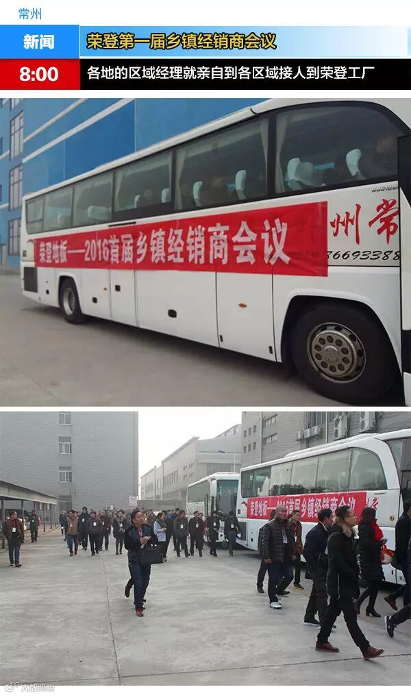 当天一大早,各地的区域经理就亲自到各区域接人到荣登工厂,大巴上还拉了横幅欢迎经销商。