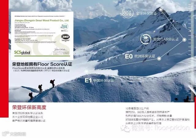 现在荣登也已得到美国顶级权威科学认证体系,三大全球顶级地板企业认可,最严格的测量和健康基础认证Floorscore®认证,晒出了荣登环保的新高度。为的就是让“这块地板”更进一步!