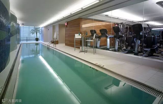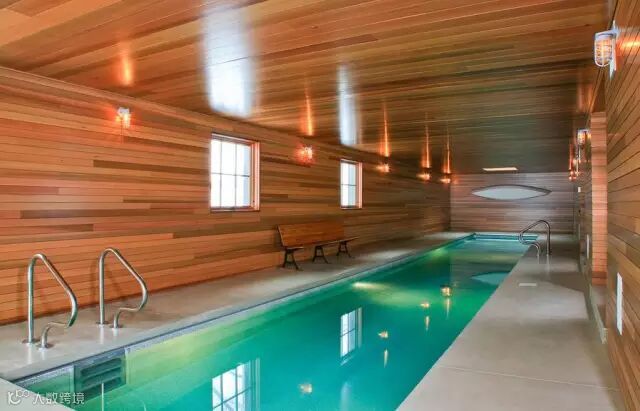 室内泳池对光线的要求更高,在泳池旁设立一排落地窗,自然光线和灯光打造出户外效果。