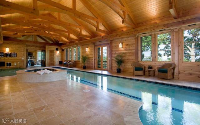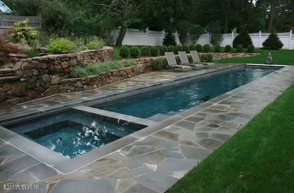 如果泳池设计还带有娱乐休闲目的,那么有一个温泉的氛围是必要的,它可以通过木材石头的使用来舒缓情绪。同时添加一个热水浴缸和休闲区,让给游泳成为一项令人愉悦的休闲方式。