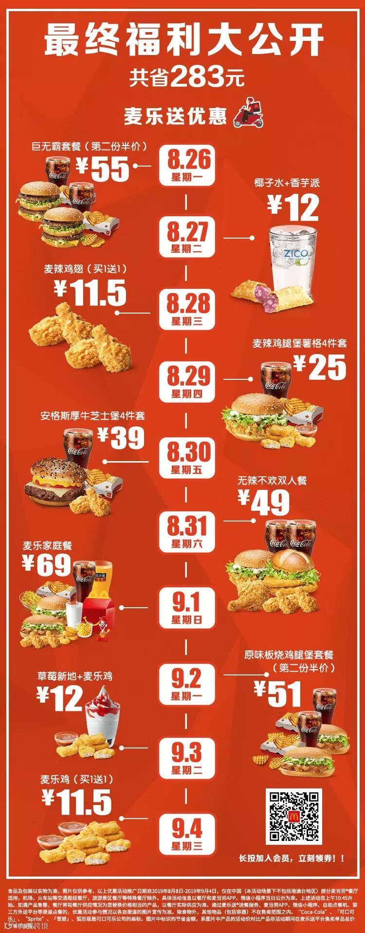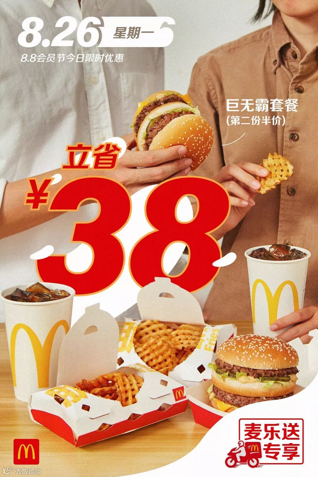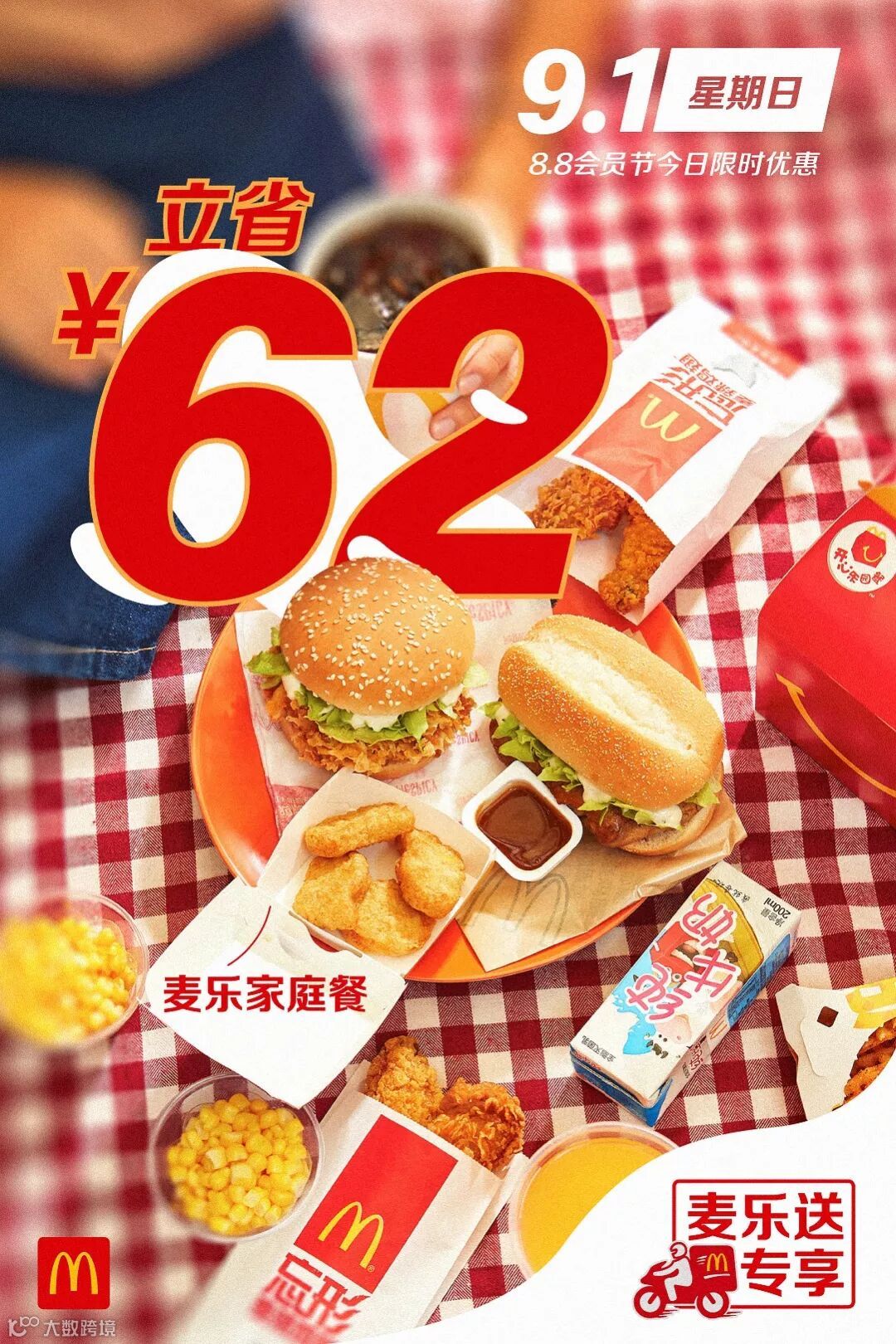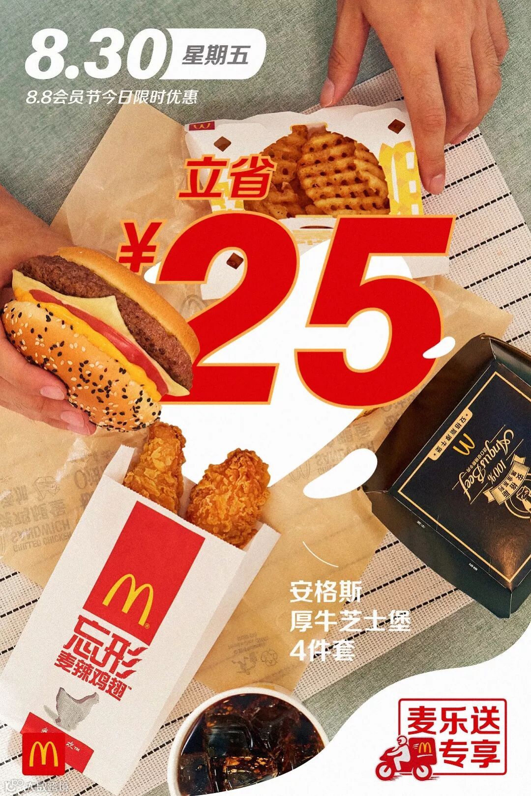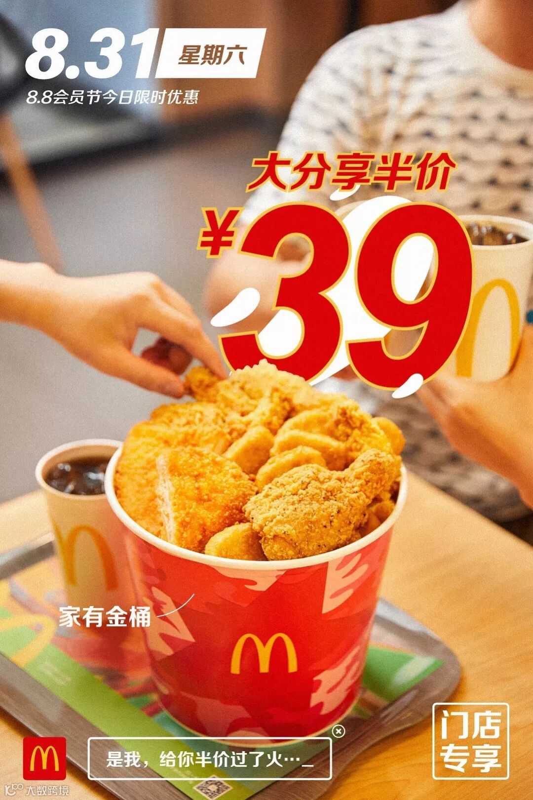 食品及包装以实物为准,图片仅供参考。半价是指家有金桶产品的价格,相当于其中所含单品非优惠活动时单品总价的一半。以上优惠活动推广日期自2019年8月8日-2019年9月4日,仅在中国(本活动场景下不包括港澳台地区)部分麦当劳餐厅适用,机场,火车站等交通枢纽餐厅,旅游景区餐厅等特殊餐厅除外。具体活动信息以餐厅和麦当劳APP、微信小程序当日公示为准。上述活动自上午10:45开始。如遇产品售罄,餐厅将视餐厅供应情况为您替换价格相当的产品,以餐厅实际供应为准。通过麦乐送送餐服务、麦当劳APP、微信小程序、自助点餐机、第三方外送平台等渠道点餐的,优惠活动参与情况以各自渠道的图片宣传为准。除食物外,其他物品(包括容器)不在售卖范围之内。“Coca-Cola”、「可口可乐」、“Sprite”、「雪碧」、弧形瓶是可口可乐公司的商标。图片中标识的共省金额133.5元起计算基于产品在餐厅售卖的最低价格计算。图片中标识的节省金额283元及其他麦乐送专享海报中显示的立省金额,系图片中产品的活动价对比产品非活动期间在麦乐送平台售卖单品总价节省的金额。