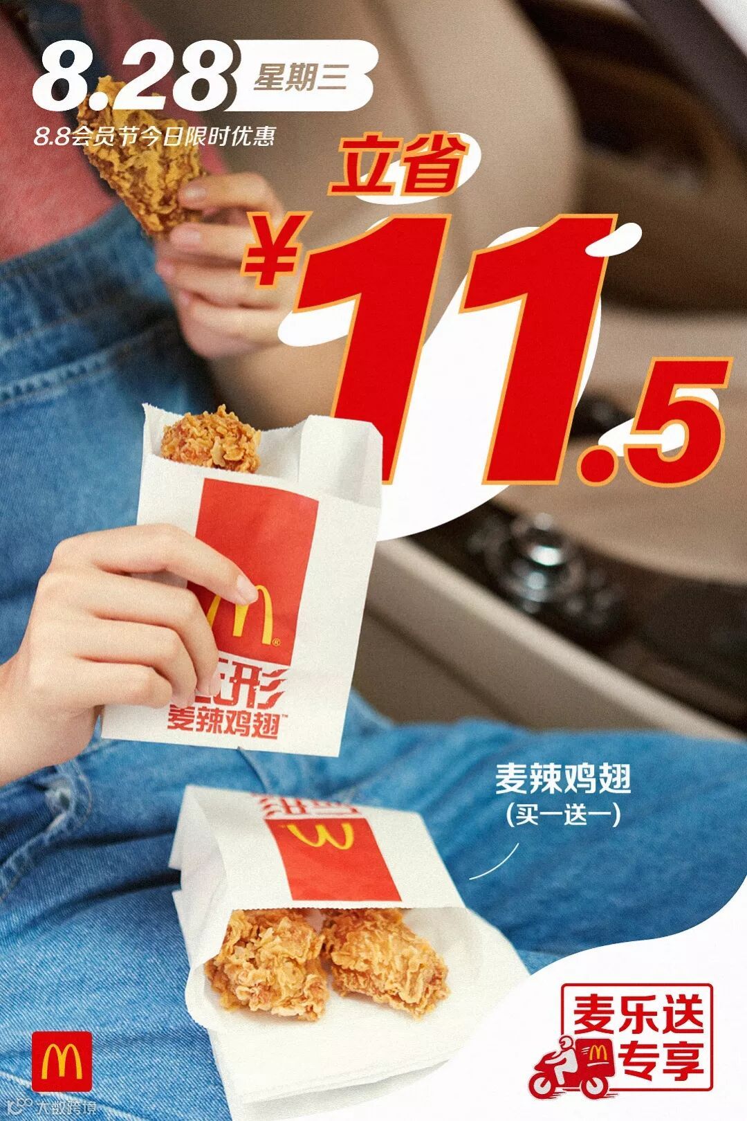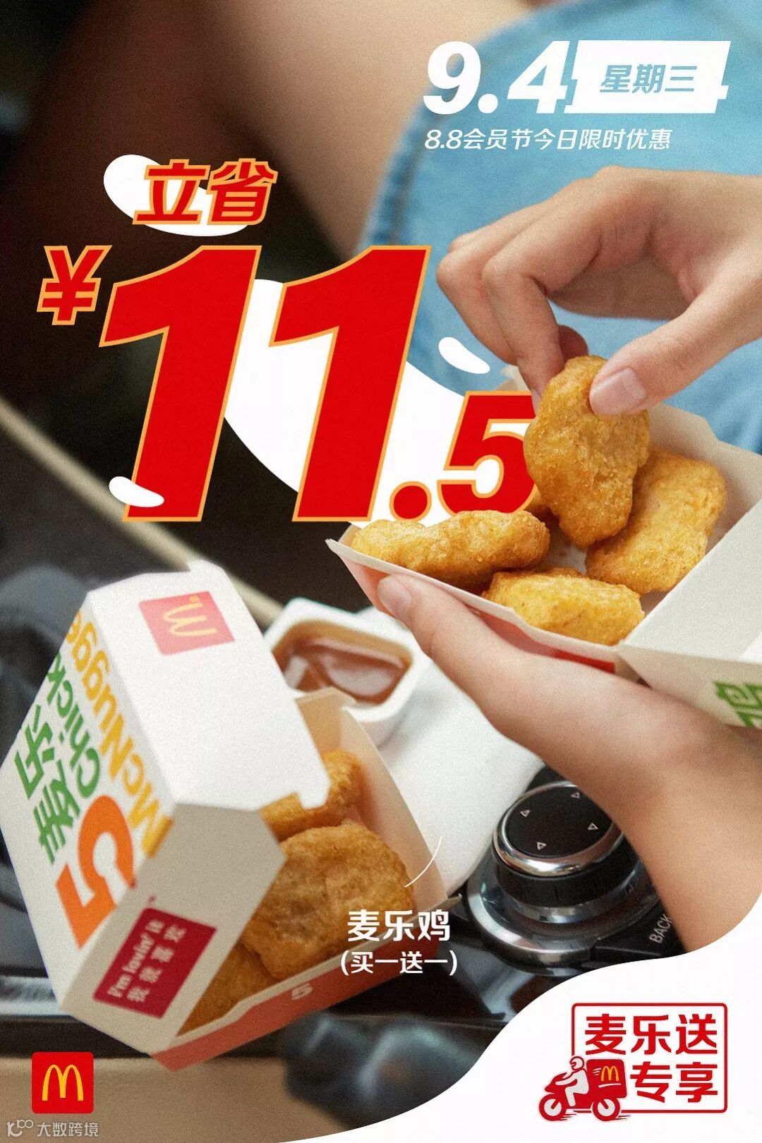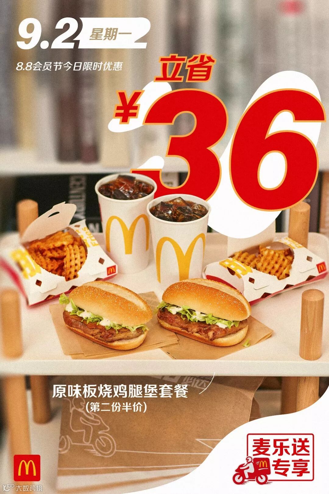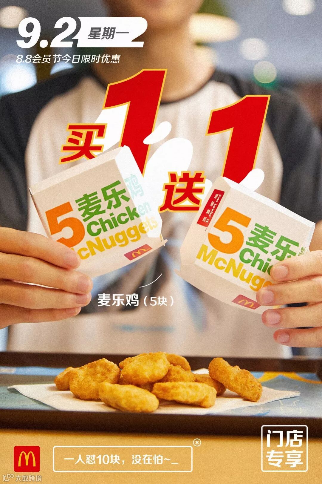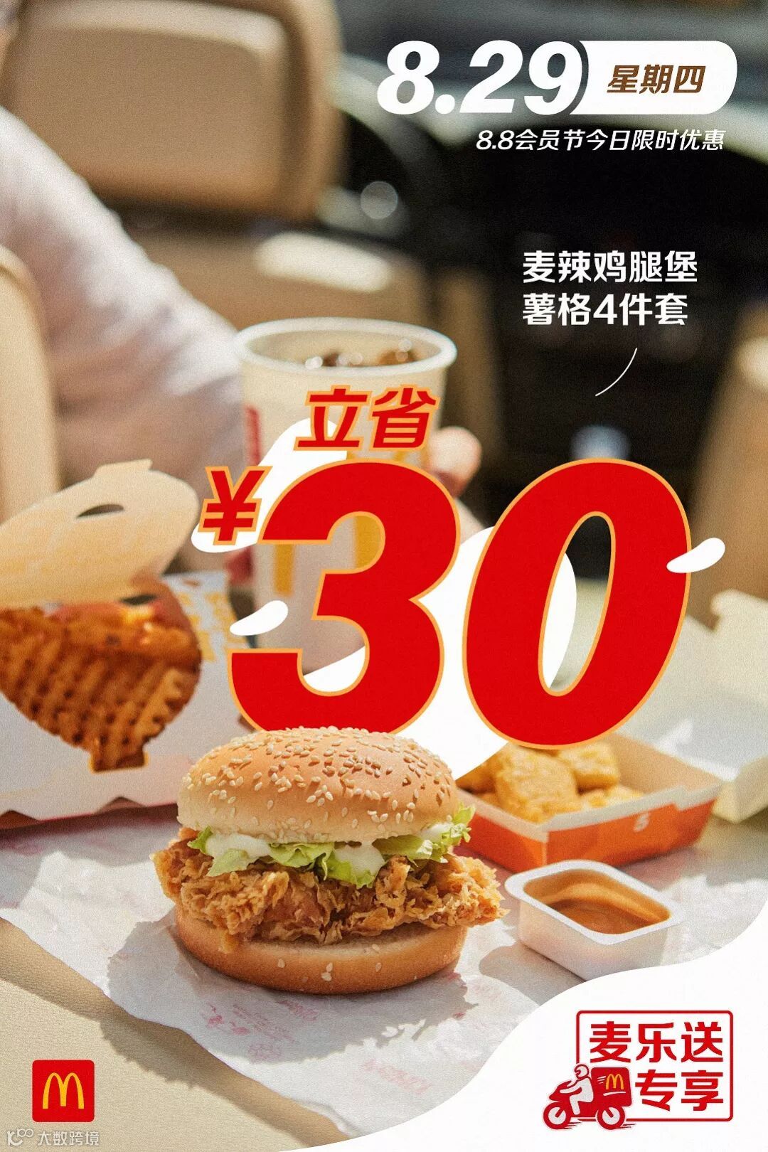 食品及包装以实物为准,图片仅供参考。半价是指家有金桶产品的价格,相当于其中所含单品非优惠活动时单品总价的一半。以上优惠活动推广日期自2019年8月8日-2019年9月4日,仅在中国(本活动场景下不包括港澳台地区)部分麦当劳餐厅适用,机场,火车站等交通枢纽餐厅,旅游景区餐厅等特殊餐厅除外。具体活动信息以餐厅和麦当劳APP、微信小程序当日公示为准。上述活动自上午10:45开始。如遇产品售罄,餐厅将视餐厅供应情况为您替换价格相当的产品,以餐厅实际供应为准。通过麦乐送送餐服务、麦当劳APP、微信小程序、自助点餐机、第三方外送平台等渠道点餐的,优惠活动参与情况以各自渠道的图片宣传为准。除食物外,其他物品(包括容器)不在售卖范围之内。“Coca-Cola”、「可口可乐」、“Sprite”、「雪碧」、弧形瓶是可口可乐公司的商标。图片中标识的共省金额133.5元起计算基于产品在餐厅售卖的最低价格计算。图片中标识的节省金额283元及其他麦乐送专享海报中显示的立省金额,系图片中产品的活动价对比产品非活动期间在麦乐送平台售卖单品总价节省的金额。