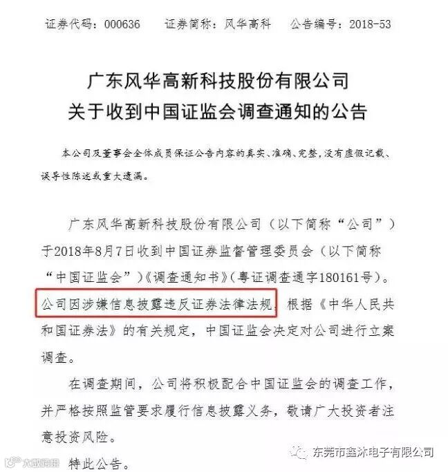 公告显示,8月7日风华高科收到中国证监会下发的《调查通知书》,风华高科因涉嫌信息披露违反证券法律法规,中国证监会决定对风华高科进行立案调查。风华高科称,在调查期间,公司将积极配合中国证监会的调查工作,并严格按照监管要求履行信息披露义务。