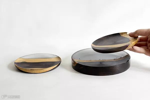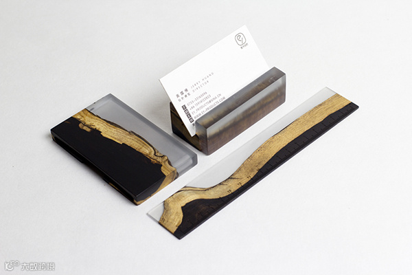 意外设计主题展为「一段废弃木头的重生之旅」,重点是利用黑檀木的边皮木料与树脂结合创作的办公用品「微山水」系列,包含镇纸、直尺、名片架、名片盒等文具产品。