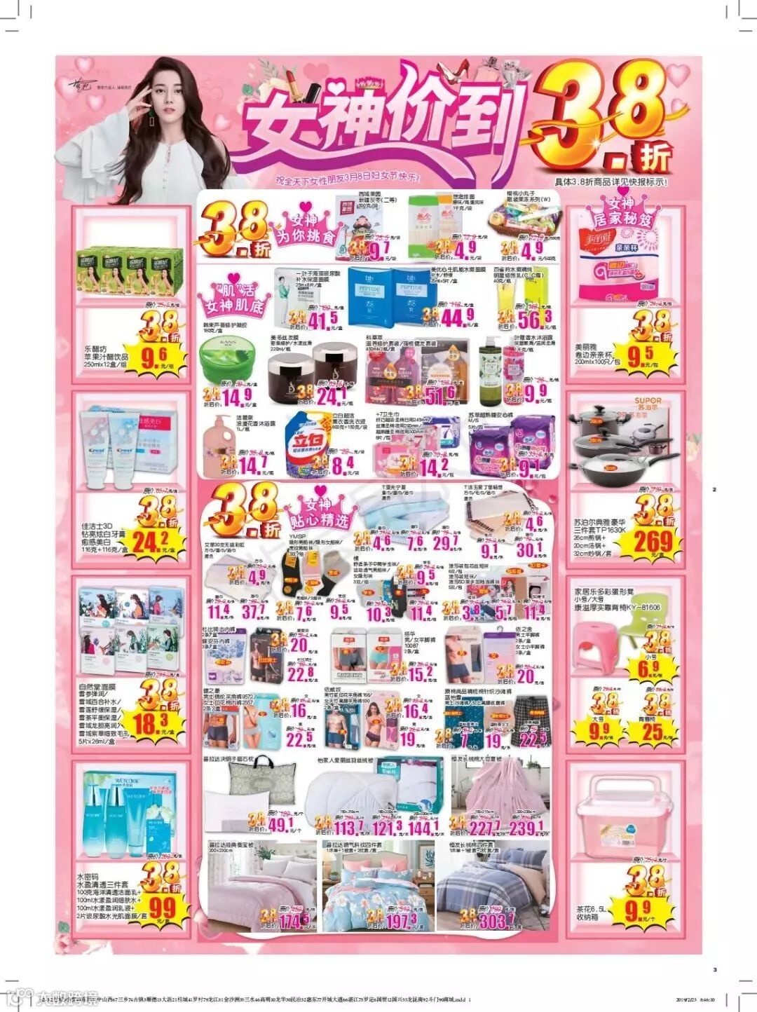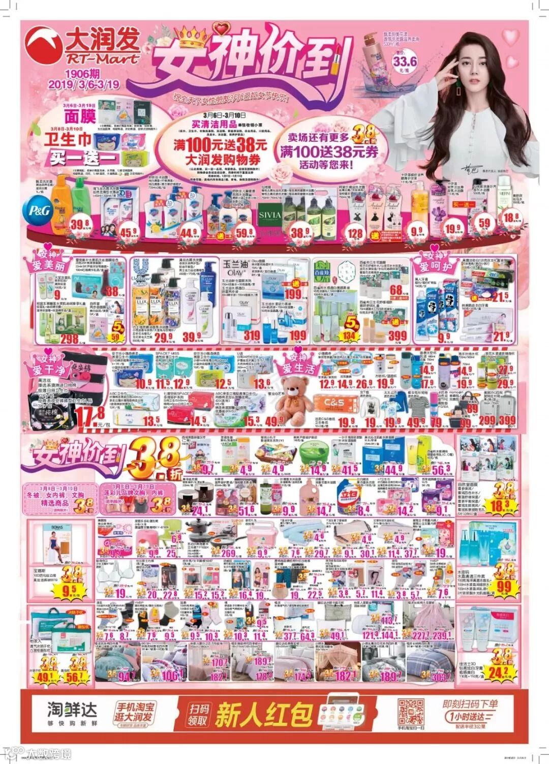 3月9日-3月19日,大润发女神价到活动,卖场商品3.8折,满100元送38元券,活动等美美的您来选购!