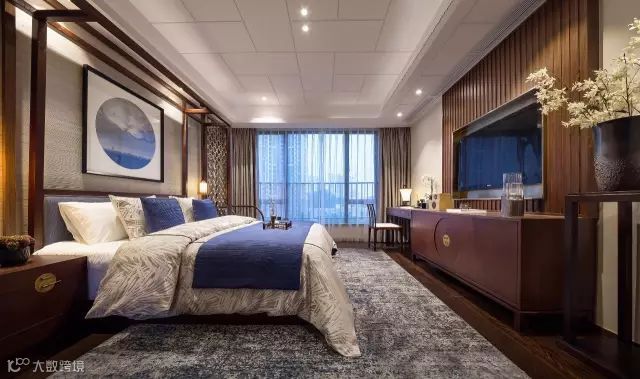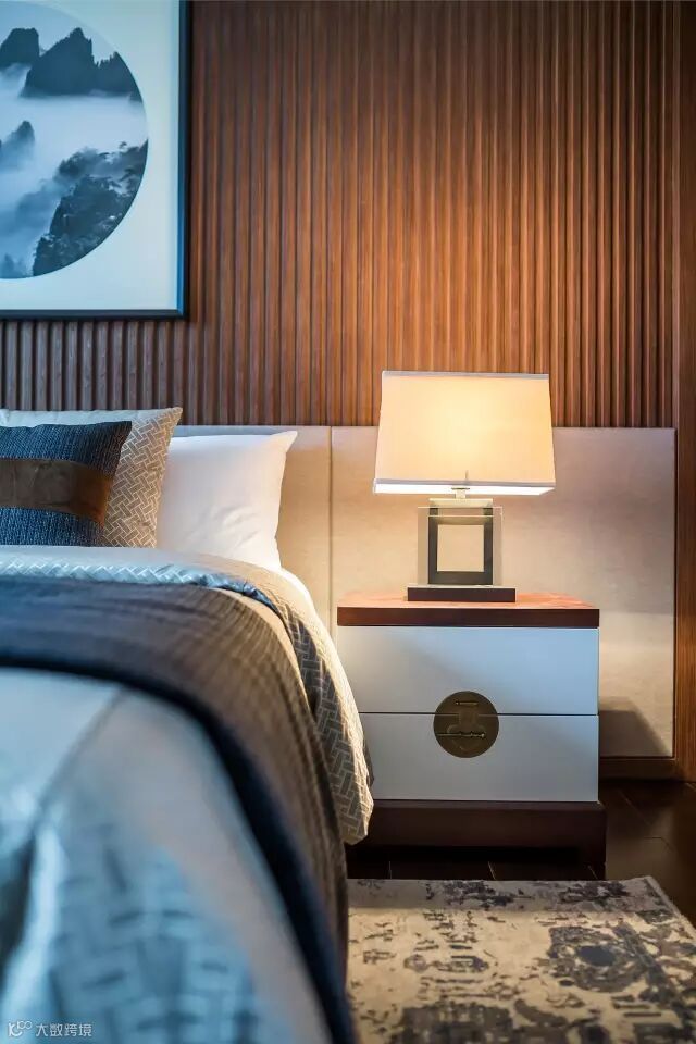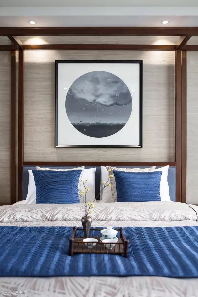 设计从东方传统元素与现代产物撞击融合的角度出发,吸取精华,恰当地表达当下的审美。米色的织物与胡桃木质对撞出温暖却不失格调的空间,蓝色的布艺肆意地发挥抽象简约的色彩力量,无形中增加空间一种沉静的张力。