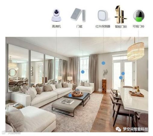 智能家居提供全面的家庭安防系统,包括智能门锁、可视门铃、室内监控、门磁、红外入侵探测、烟雾报警、水浸报警、可燃气体探测等。