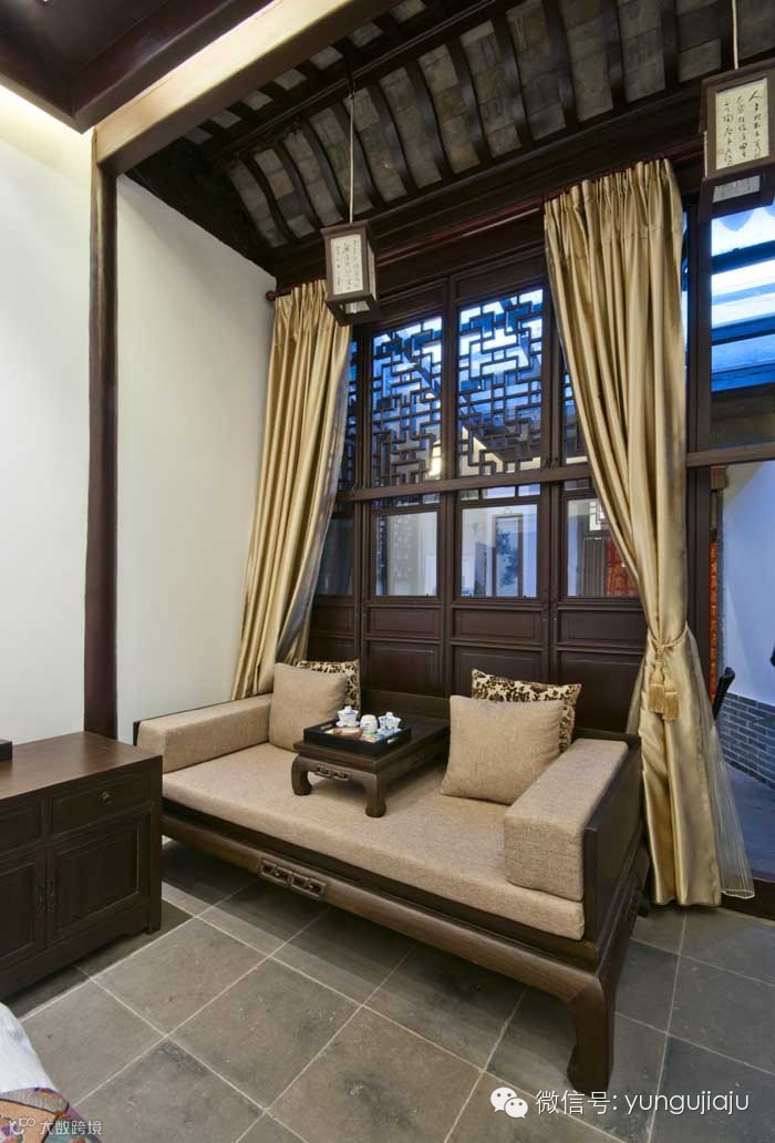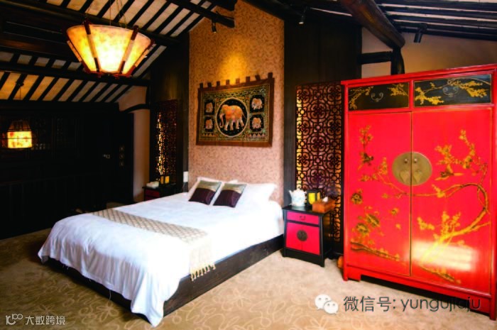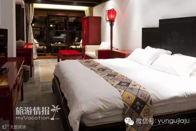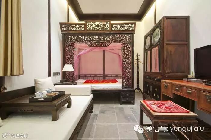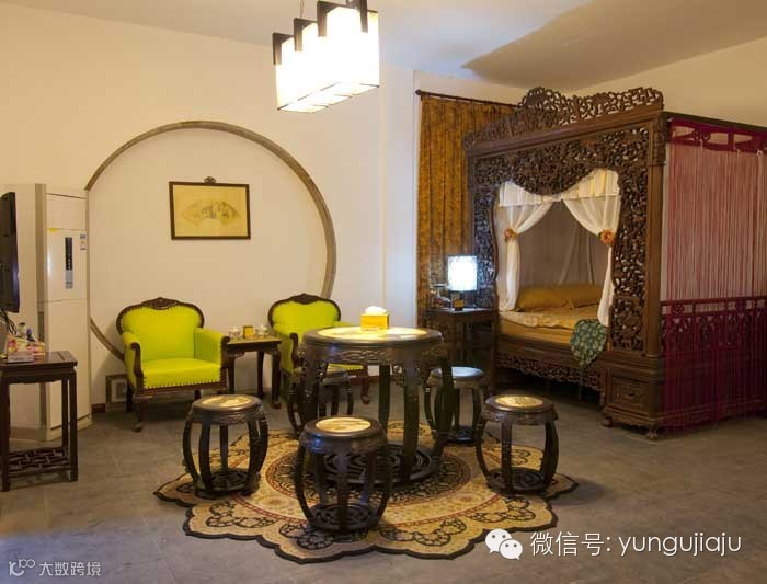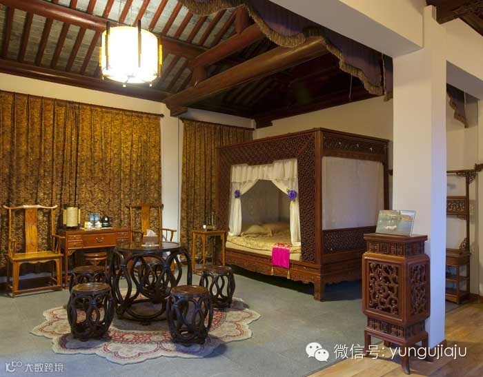 两幢楼中,一号楼是精品客房,汇集了老板多年的精品收藏。二号楼则更现代一些,接近一般酒店的水平,但韵味和品质要比一号楼略差些。这儿共有24间客房,其中11间为豪华明清大套房。