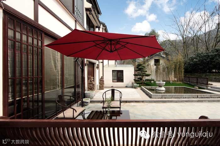 隐居西湖的三栋别墅分别是一叶闲、越语禅和水闻道,都以新中式风格为主,独栋别墅外面还有一个独立的庭院,放着三两张小桌椅,撑起一把遮阳伞,很是休闲。这里从环境选择到氛围营造,均以中年人为目标人群。选址在与法喜寺隔街而望的山腰上,四面环山、绿荫遮地,环境相当隐蔽。