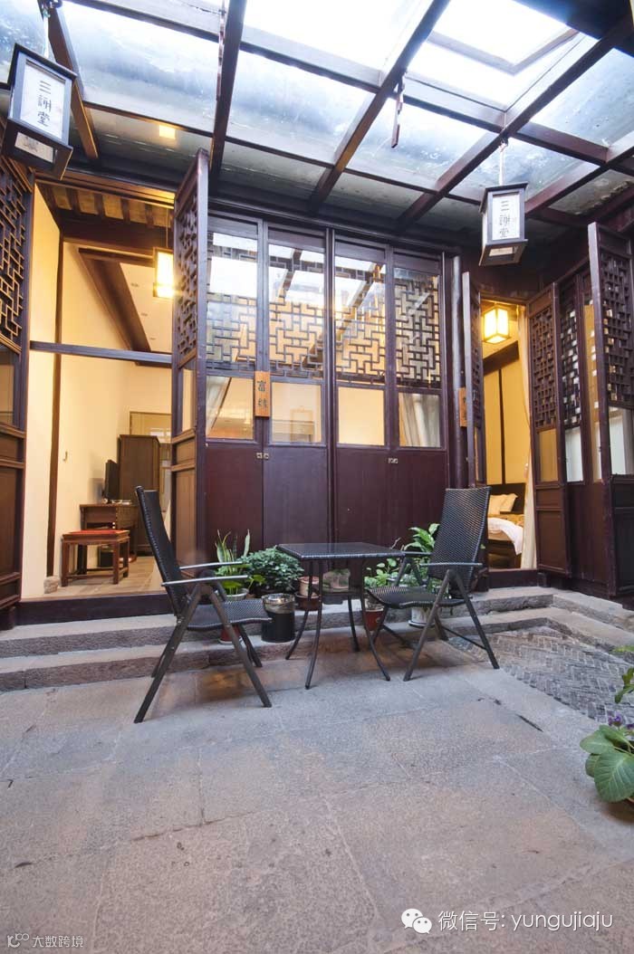 走过紫兰晓筑正中那个大大的庭院,穿过一条贴有众多苏州老照片的回廊,就到了客栈内的住宿区。这儿共有两栋住宿楼,一前一后,各有自己的庭院,令人意外的是,和其他民宿不同,这儿的庭院门口还有个特殊装置,住客需要刷房卡才能进入,私密性非常好。