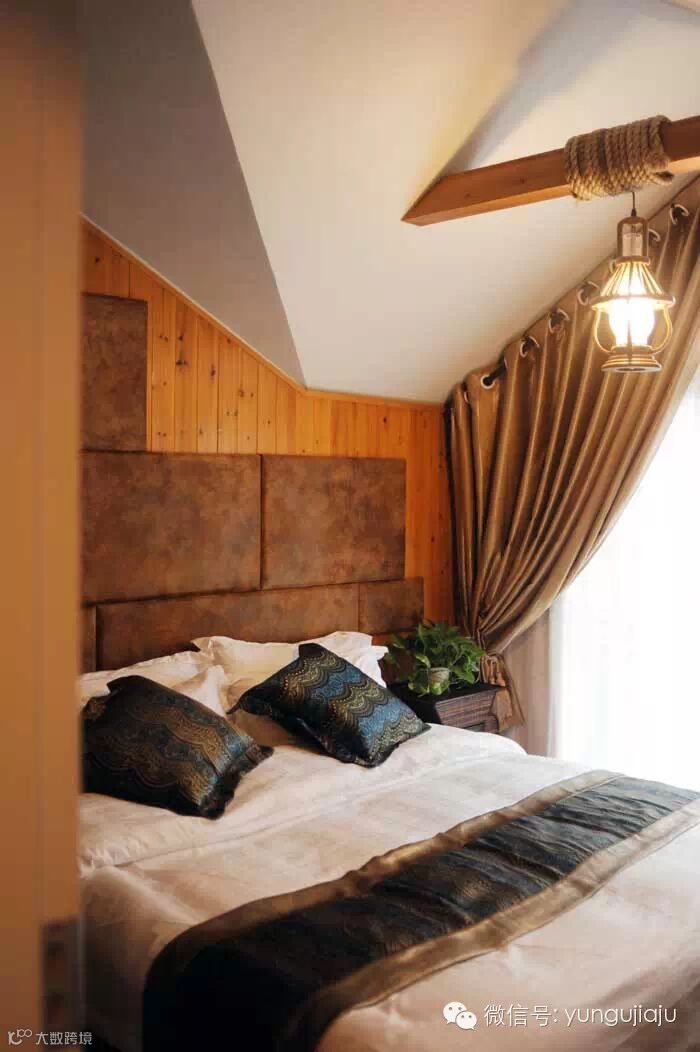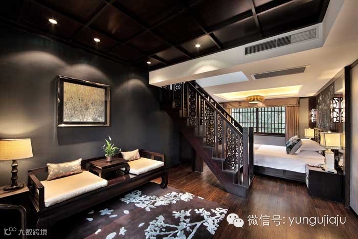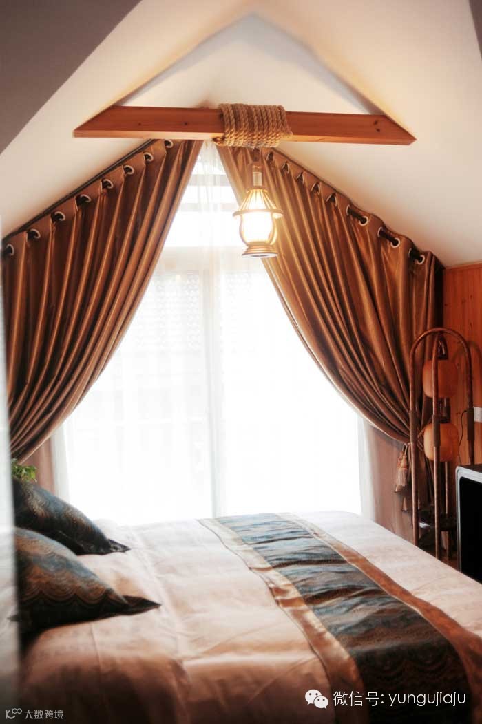在设计风格上,除了日式的灯和一些千纸鹤的画面,一叶闲的风格还是以中式为主。深褐色与白色是主色,很搭调,气氛上让人感觉很沉稳。用的材料和设备一点都不含糊,品质不低,品位不俗。进门是个挑空二层的客厅,原来应该是个中式天井,加了个屋顶。底楼的后半部,在楼梯后面,是个带有卧室、书房、卫生间的套房,面积都不大,稍显暗了一些,但阴凉宁静。楼是斜顶,前后各有一个阳台。在后阳台上,你会觉得自己被四周绿意盎然的山峦紧紧环绕,空气特别清爽。