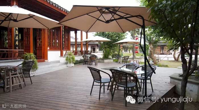老板在沿河的一侧做了一个露天咖啡吧,藤制的桌椅、精致的彩瓷茶具,闲时坐在这里喝杯咖啡,听古琴声余音饶耳,度假感十足,尤其是一早一晚旅行团还未至时,住客更可以在这儿独享一片清净。清晨也可步行十分钟,去灵岩山上礼佛,之后吃素斋。