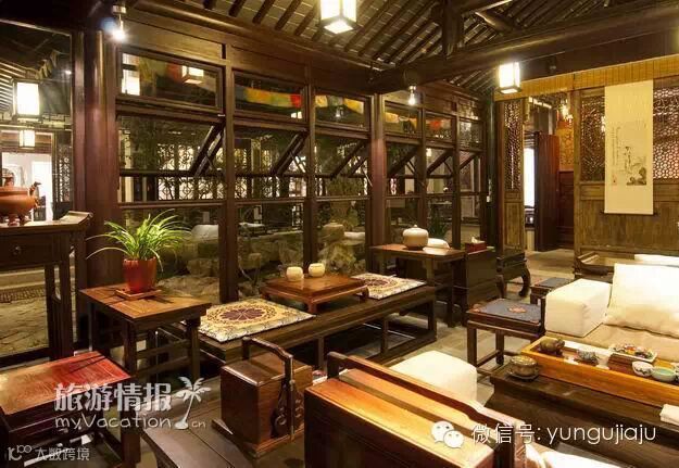 心灵客栈以多栋白墙黑瓦灵隐茶园民居改建而成,古朴的中式外形,未进入店内,就有种让人静下心来的感觉。因为走的是主题路线,所以店内的设计风格非常独特:店主精心淘来的藏柜、描花木椅、水墨画、木雕窗扇,配上桌上摆放的笔墨纸砚与空气中淡淡的焚香味道,充满了一种古典的韵味。