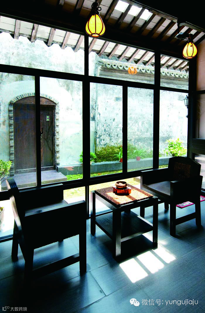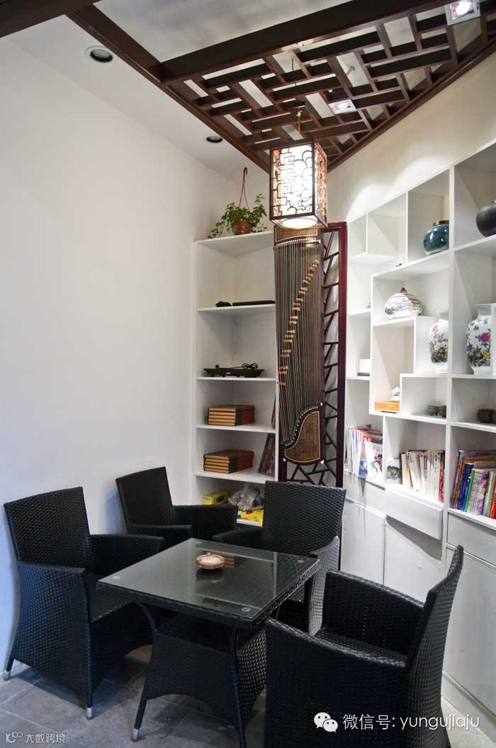 典型的江南民居的格局,进门的客堂现在已经改成了客栈大厅,正中央摆放着香台,左边是一个咖啡吧,右边则是白色的书架。藏香的味道,飘散在整个客栈里,幽幽的,很有些意境。