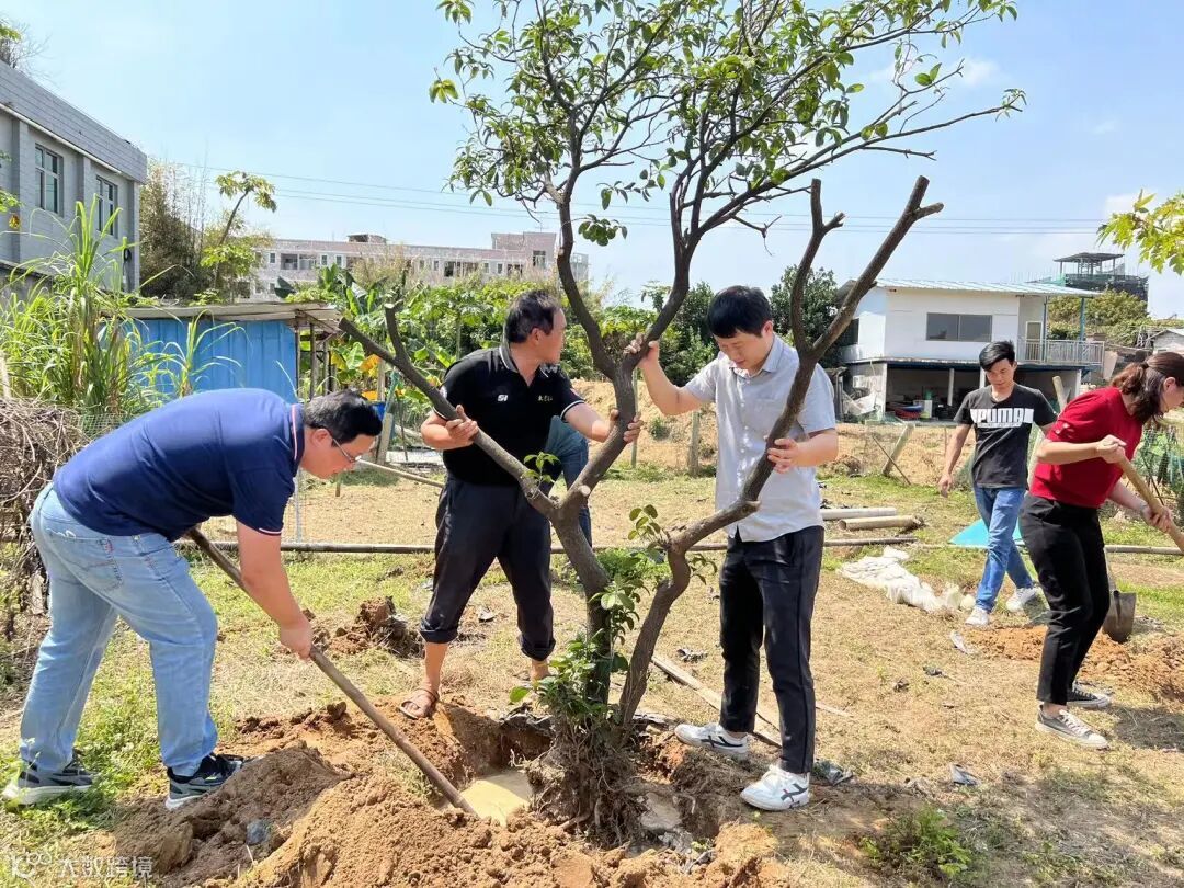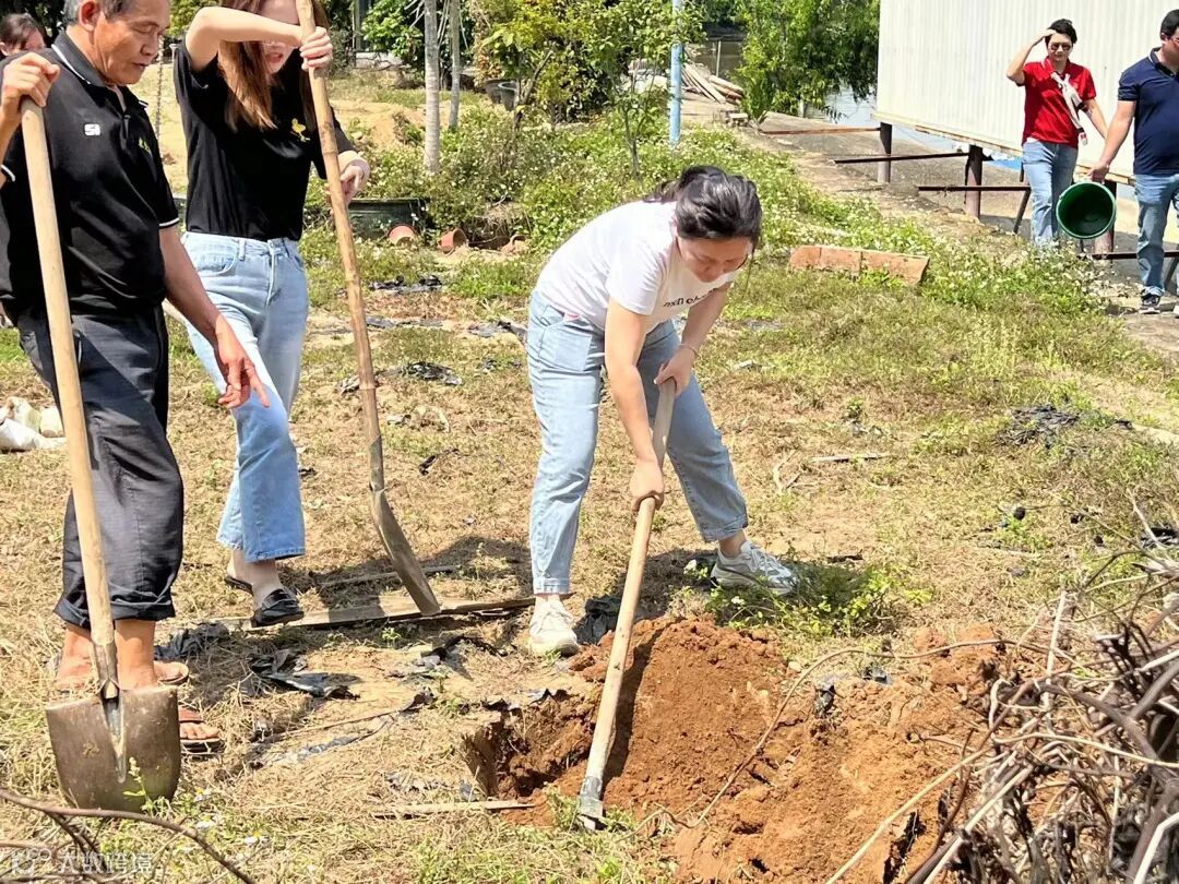 寓意着大家凝心聚力共创未来,借助发展新机遇,乘势而上开启崭新征程。在种植有机蔬菜现场,大家挥锹铲土、扶苗填坑、浇水添土。大家各司其职,配合默契!