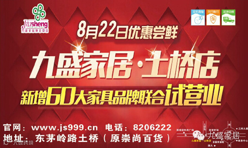 九盛家居.土桥新店新增三万平专业家具卖场,新进60大一线家具品牌。8月22日试营业,9月13-14日盛妆开业:开业巨惠,全城轰动,一生一世,仅此一次。东茅岭路友谊市场对面(原崇尚百货)。8206222。