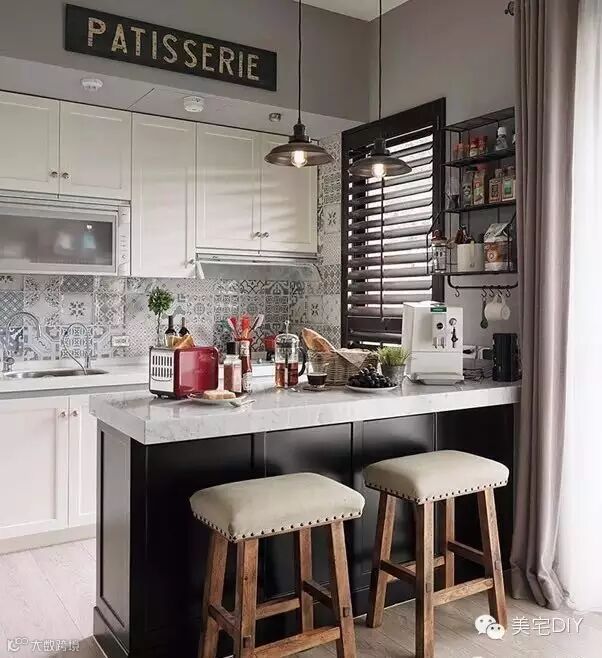 ▍在开放式厨房与客厅之间设置一个吧台,既划分了空间又可当作餐桌,这样下来便节省了餐厅区域所占的空间,晚饭过后吧台摇身一变即可变成家人好友喝一杯的好地方。