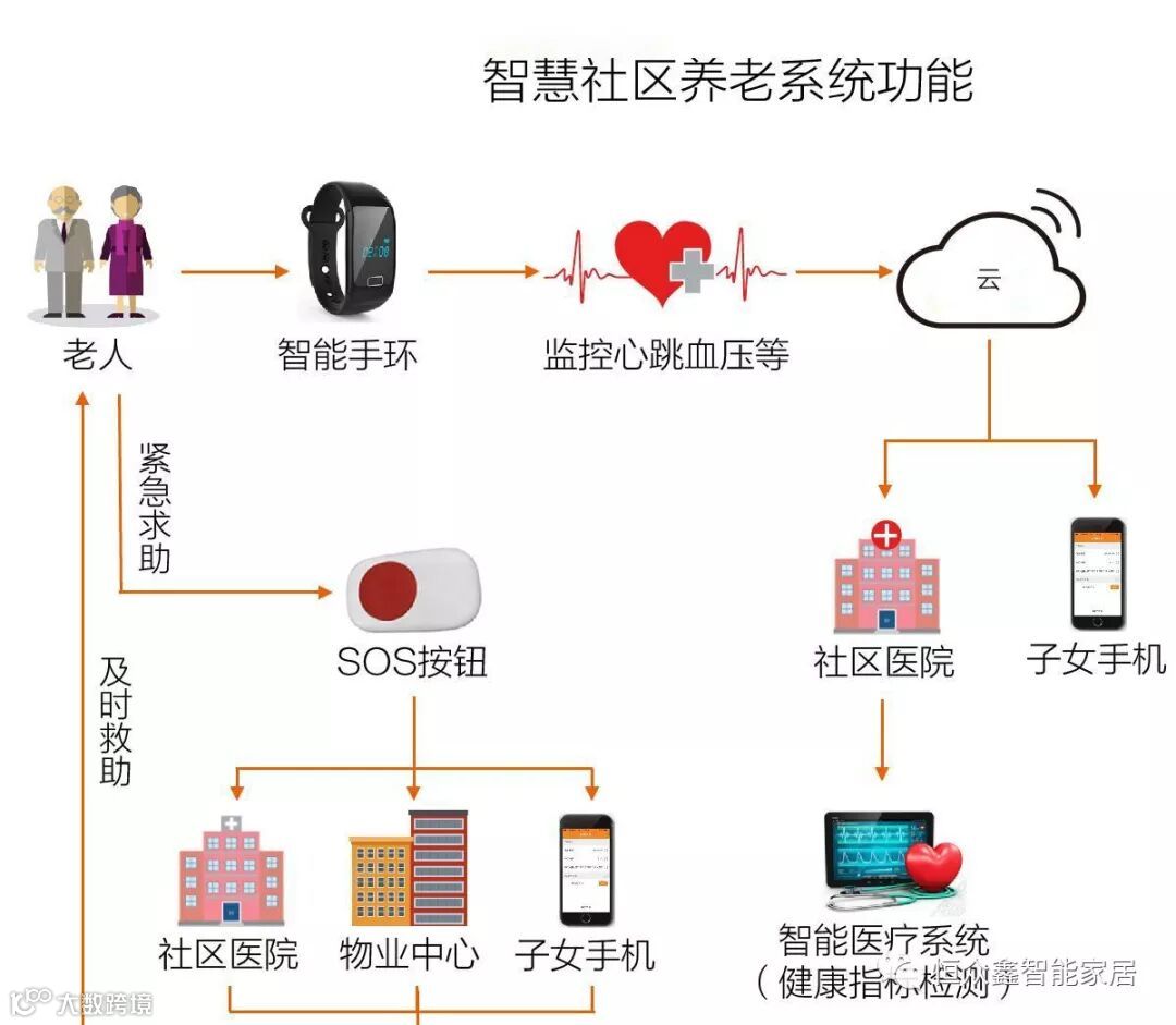 1、居家养老模式,这种养老模式相对简单,只要为家里的老人配备智能养老健康设备,智能养老健康设备如智能手环、智能血压计随时监测老人的心跳、心率、血压、血糖等人体健康指标。检测结果会通过智能云设备发送到子女家属的智能手机上,让您随时了解家里老人的健康状况。如果情况异常,声光报警器会进行实时报警,通知家人对老人的异常情况进行处理。