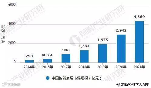 2014年,我国智能家居产业市场规模达到290亿元。2015年我国智能家居市场规模达403.40亿元,同比增长41%。到2017年我国智能家居市场规模余额达到908亿元,未来五年(2017-2021)年均复合增长率约为48.12%,2021年市场规模将达到4369亿元。以小米为代表的品牌商推出的包括智能摄像头、智能插座、智能门锁在内的各类型智能单品销售快速增长,可穿戴设备在人员看护、健康追踪领域取得进展。