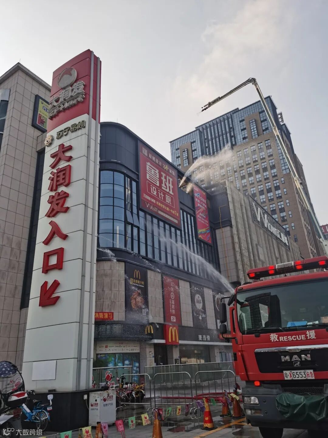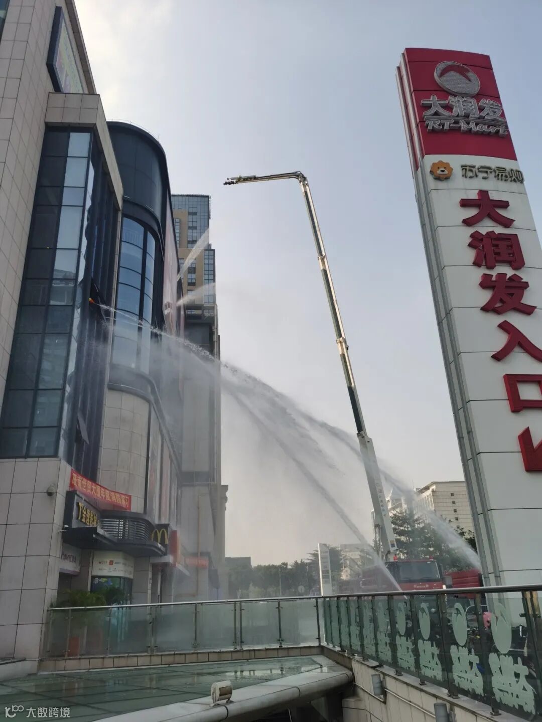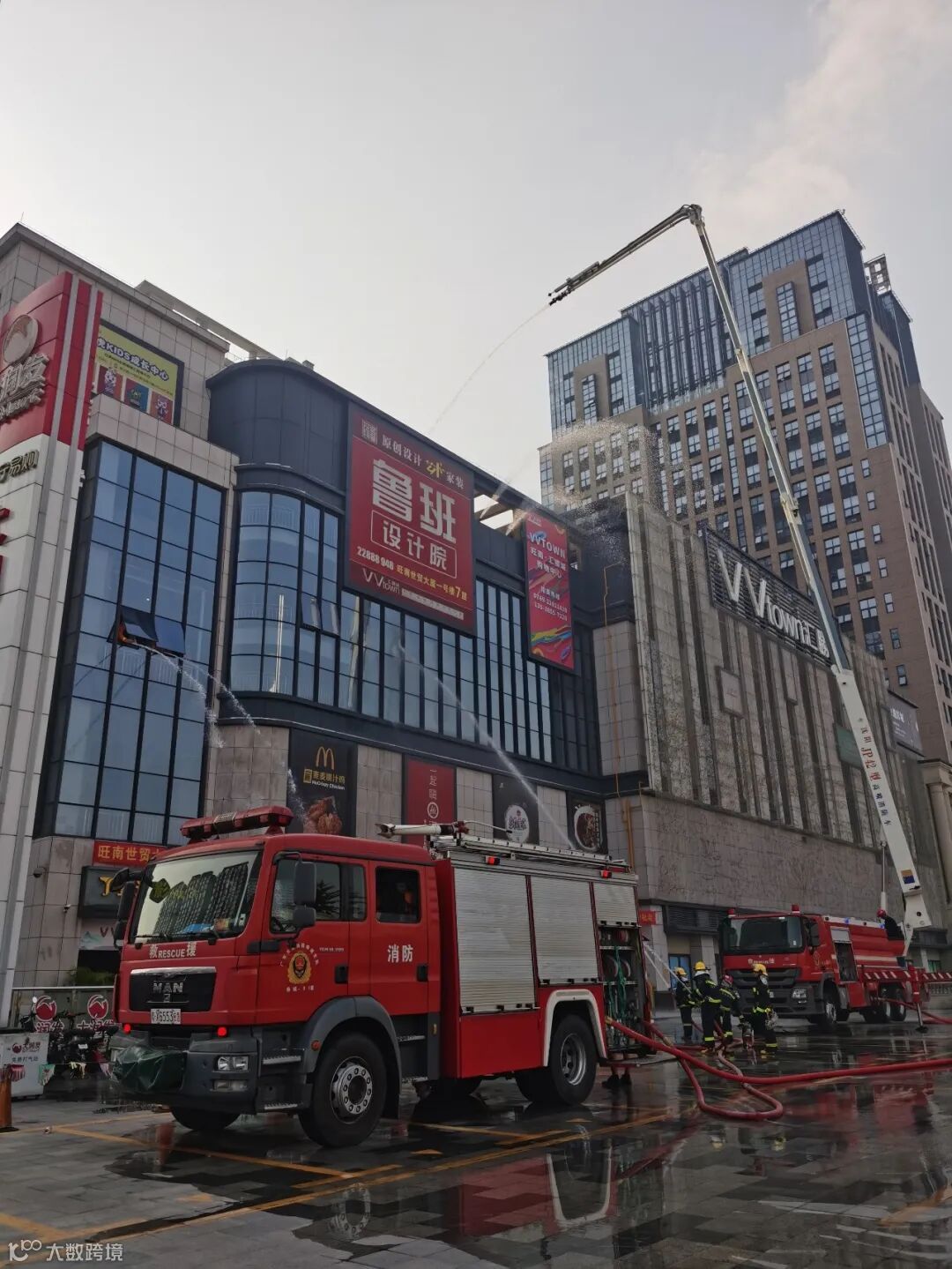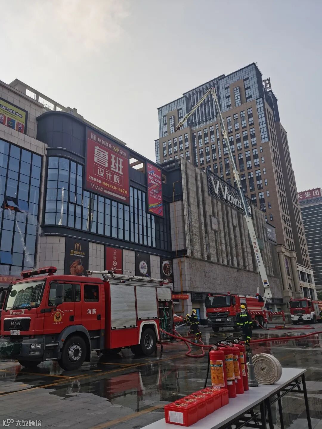 此次灭火采取“三管齐下”,先从三楼楼梯口牵出两根大水管进行“灭火”,再利用云梯车的优势从高空降水“灭火”,最后地面消防员也参与“灭火”,真正做到了全方位无遗漏式快速有效地“灭火”。