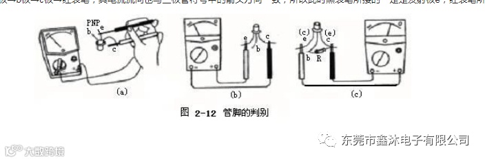 在这三次颠倒测量中,必然有两次测量结果相近:即颠倒测量中表针一次偏转大,一次偏转小;剩下一次必然是颠倒测量前后指针偏转角度都很小,这一次未测的那只管脚就是我们要寻找的基极。