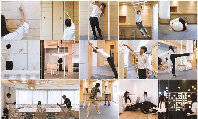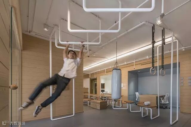 英特尔办公室的目标是在办公室的任何地方锻炼,包括使用球形橱柜拉手来健身。这些把手被刻意设计在较高的地方以便促进员工的拉伸运动。会议桌可以转变成乒乓球台,而乒乓球就在会议桌顶部的吊灯上。