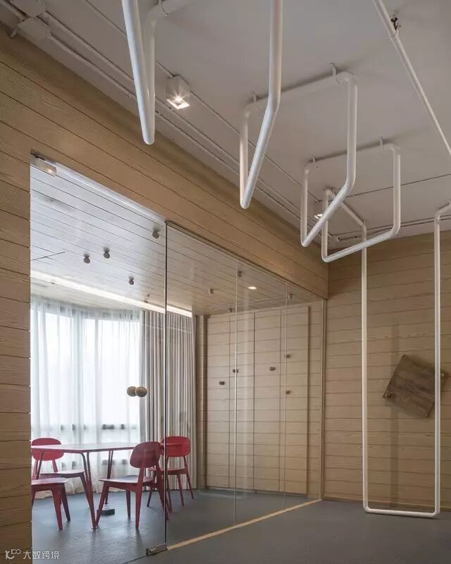 设计师利用现存的水管和电管作为办公室天花板的的装饰,并将这些新旧不一的管道漆成白色。