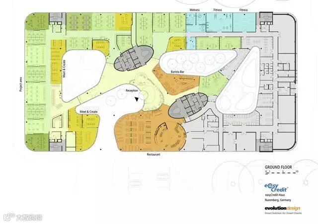 Evolution Design的内部设计观念注重于表达“轻松信贷”公司的价值观和哲学:在工作上应用创新、敏捷工作概念的方法清晰体现了公司将成为德国银行的创新与引领者的想法