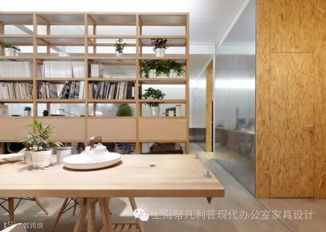 办公室内部材料使用了最简单欧松板、 镀锌板、 白漆和水泥地板。搭配了一些简单的普通绿色植物。实木家具几乎都没有油漆装饰,因而保留了独特的木材温润的质感,也为办公室提供了一种温暖的颜色,它是一种真实的感觉,是一种包容的情怀。