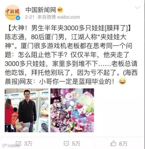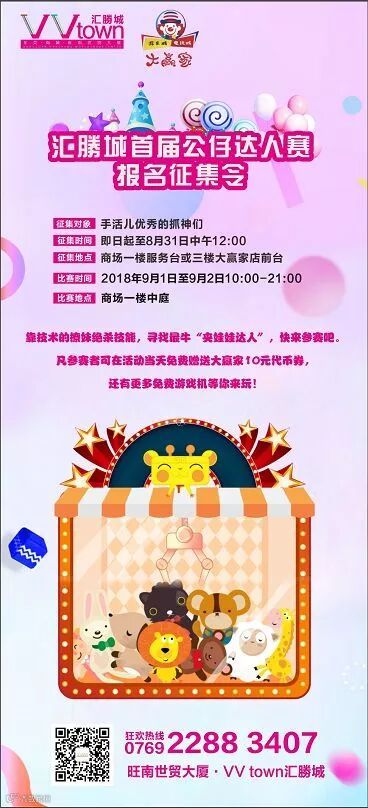 早上10:00开始签到比赛。签到后,每人领取20枚游戏币,20枚币用完夹出公仔数量最多为胜者。