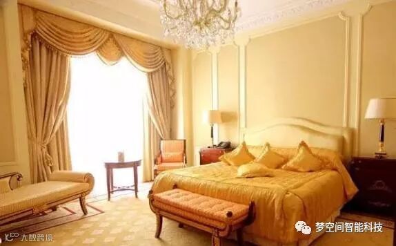 配备设施:一位调光智能开关1个、二位智能开关1个、智能插座1个、智能情景开关1个、红外广角探测器1个、紧急按钮1个、弧形双轨电动窗帘1套。