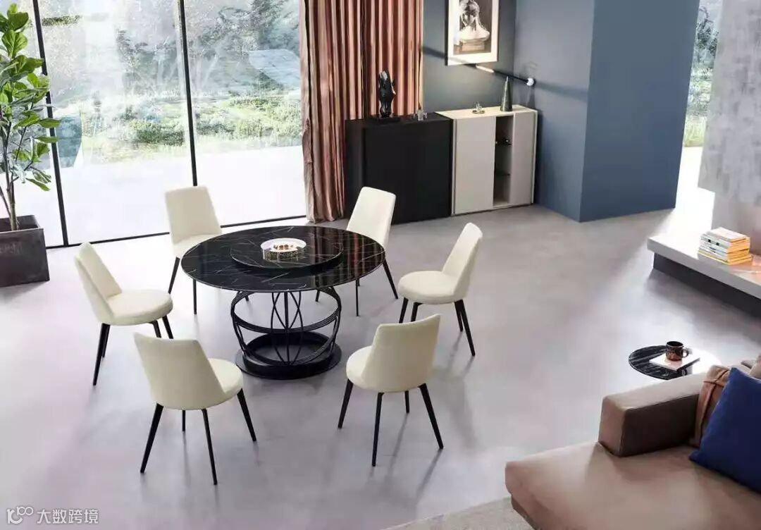 餐厅,一张黑色大理石餐桌,纹理清晰自然。搭配上白色的餐椅,简约大气。搭配一些极简的家具,轻松打造温馨用餐氛围。