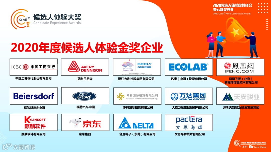 2020年,HRTechChina(人力资源科技服务平台)发起候选人(应征者)体验虚拟峰会。6月30日,线上云端颁奖正式揭晓2020年度候选人体验大奖的获得者,共57家企业提交参与评选,最终17家企业荣获2020年度候选人体验大奖的荣誉。