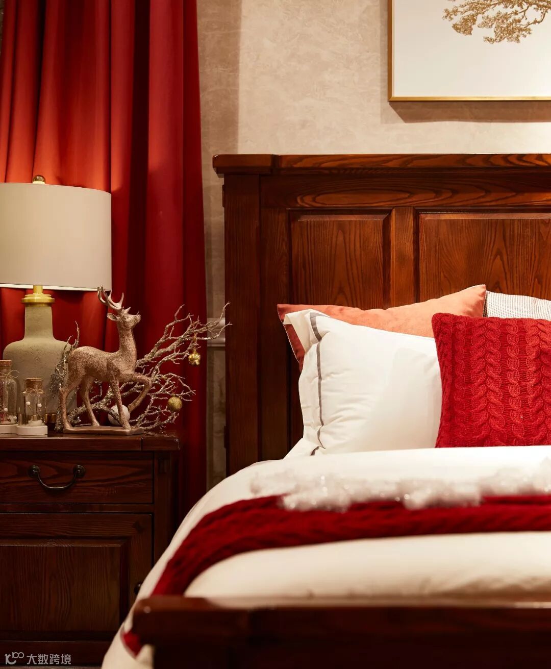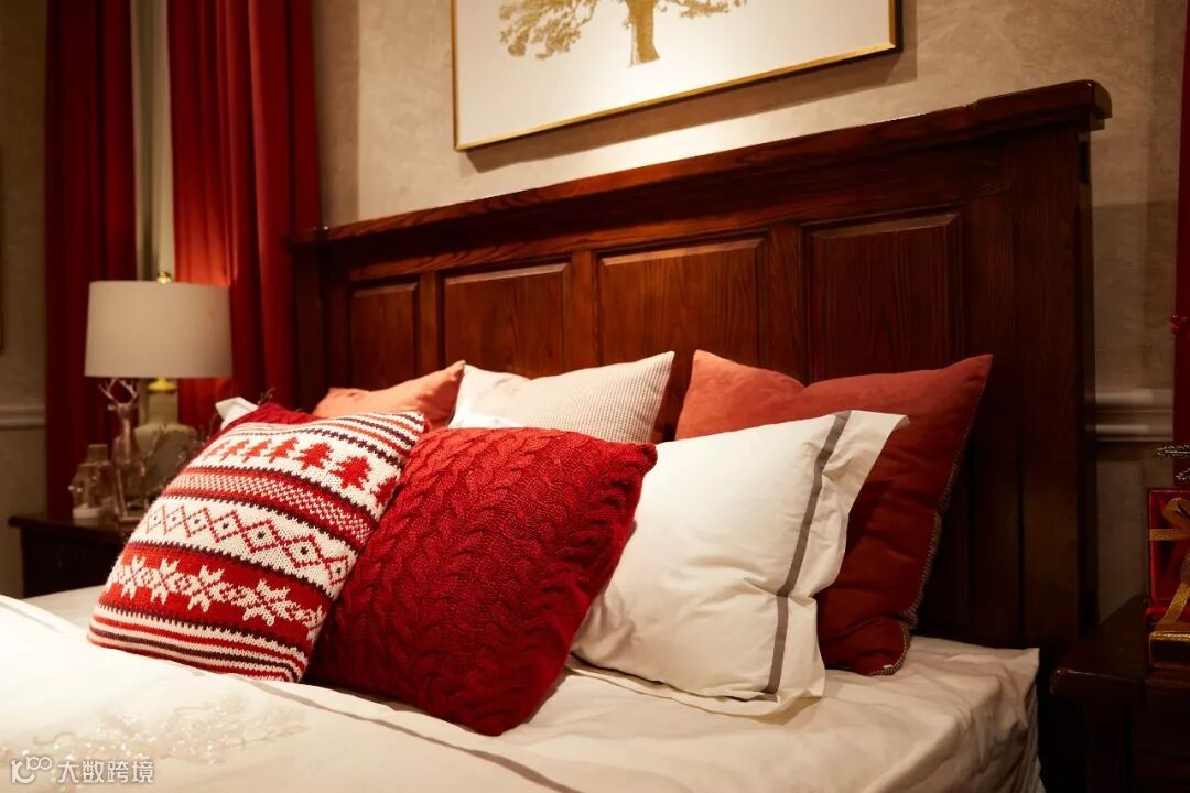 红色抱枕、窗帘、毛毯,让卧室沐浴在冬日阳光下,床头柜上的米黄色台灯,金色系麋鹿与树枝,每一个物件都蕴含了美好祝愿,白色雪花与被褥,增添了轻松自由气息,让身体与心灵如徜徉在童话世界般惬意。